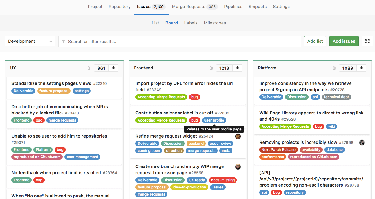 The GitLab Issue Tracker is an advanced and complete tool for tracking the evolution of a new idea or the process of solving a problem.